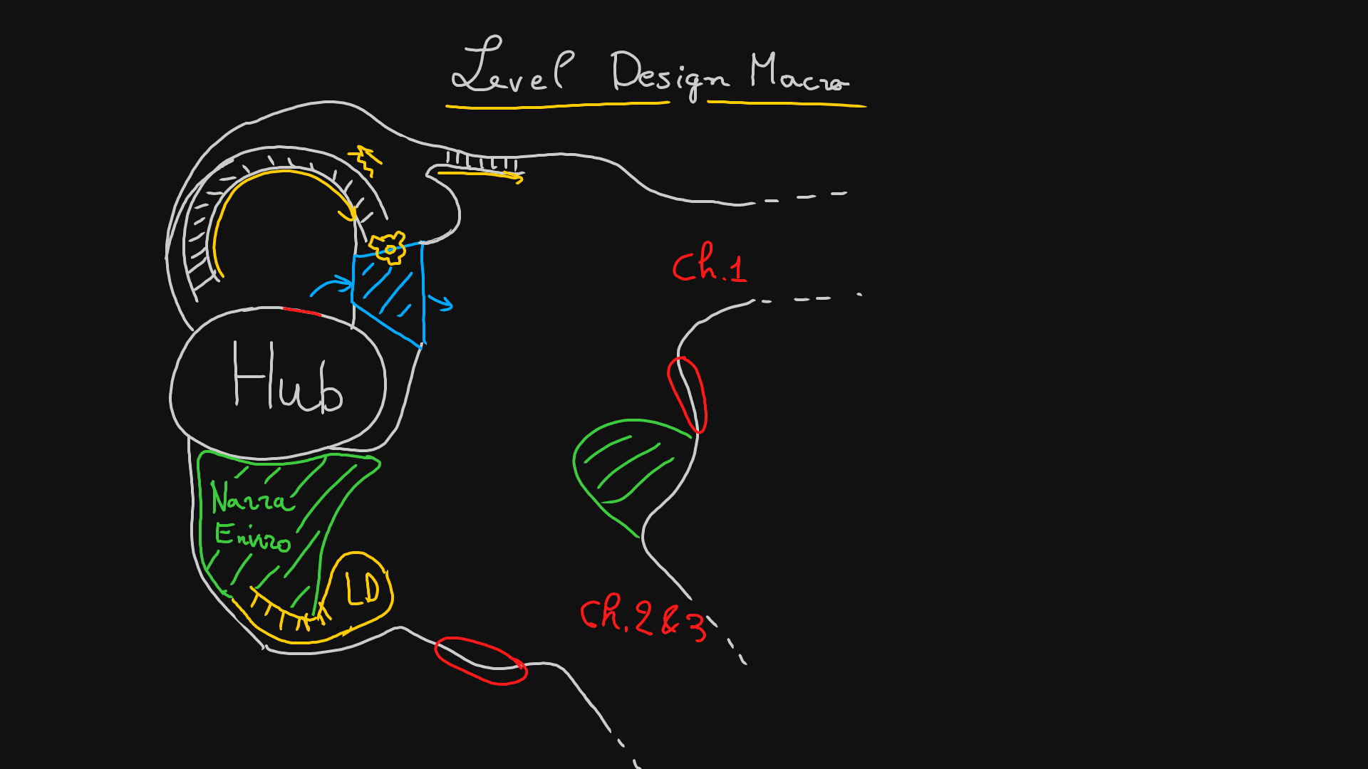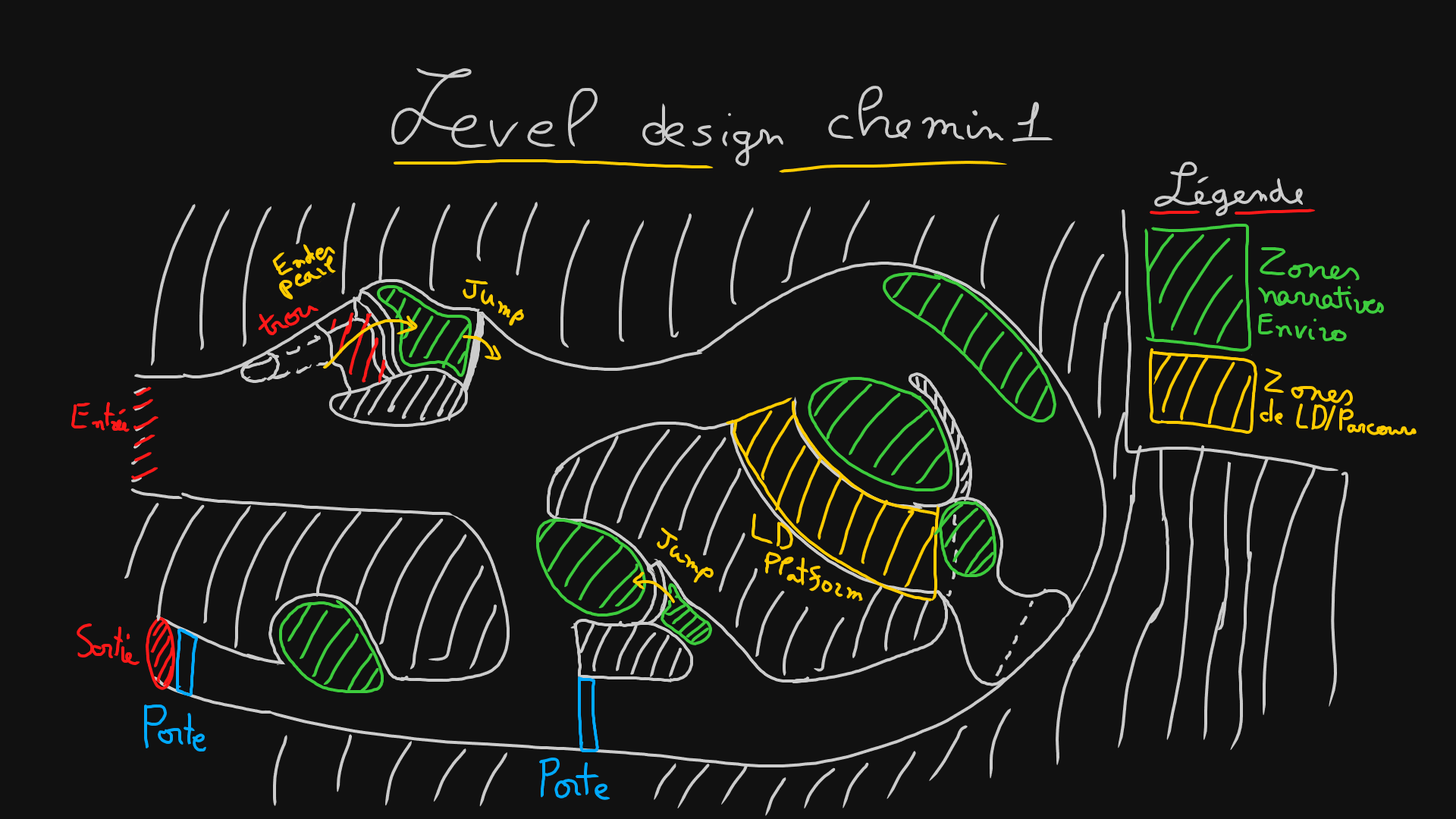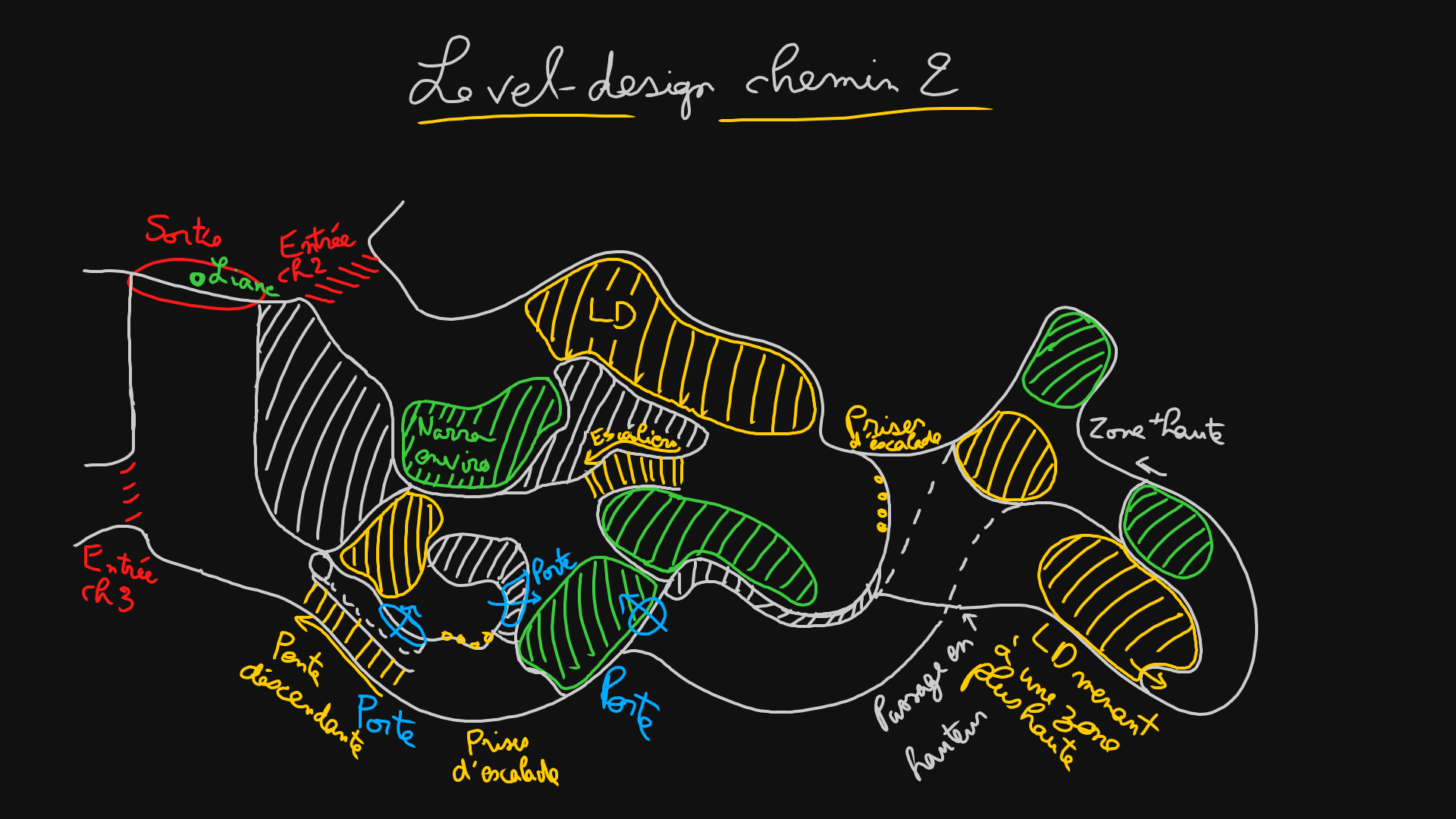 I made schematic designs for the Lobby, with explanations for everything. Yellow represented stairs or climbing paths, blue for openable doors, red for entrances to other levels, and green for areas dedicated to narrative and lore.
