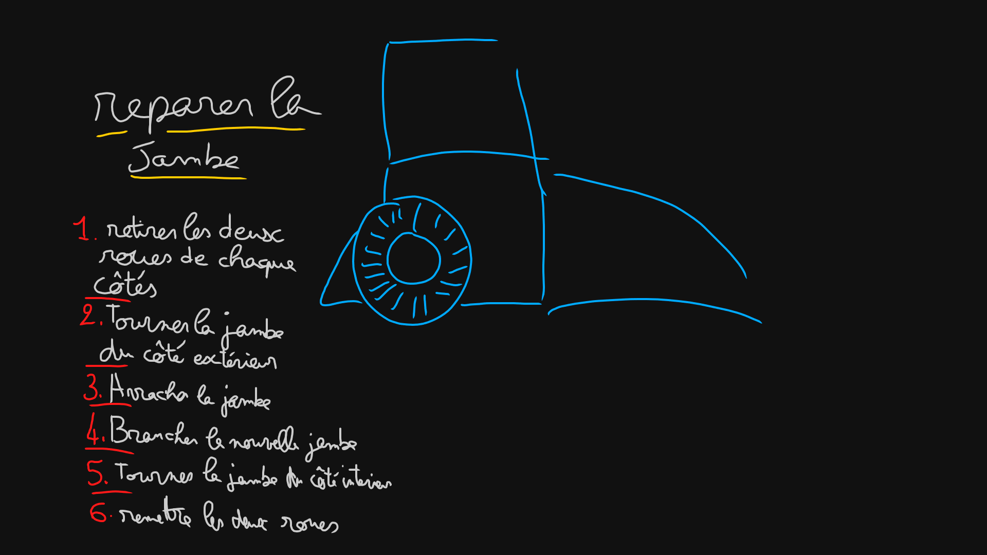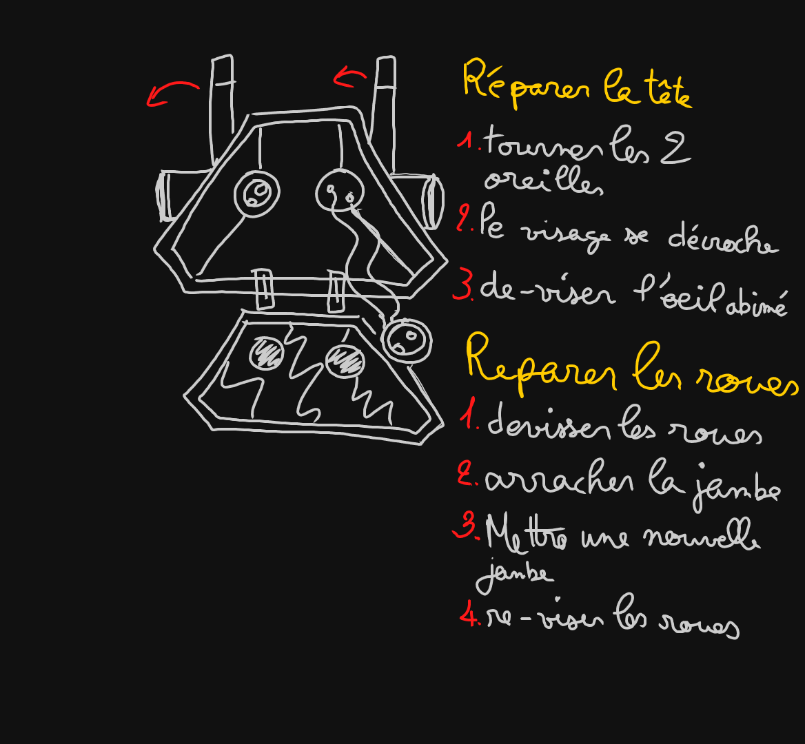 Wheel/Feet: Fully manual. Unscrew the small bolts on each side of the robot’s ankles, turn the wheel to remove it, disconnect the cut cables, insert a new wheel, reconnect the cables, and screw everything back in place. Voilà —a repaired wheel.