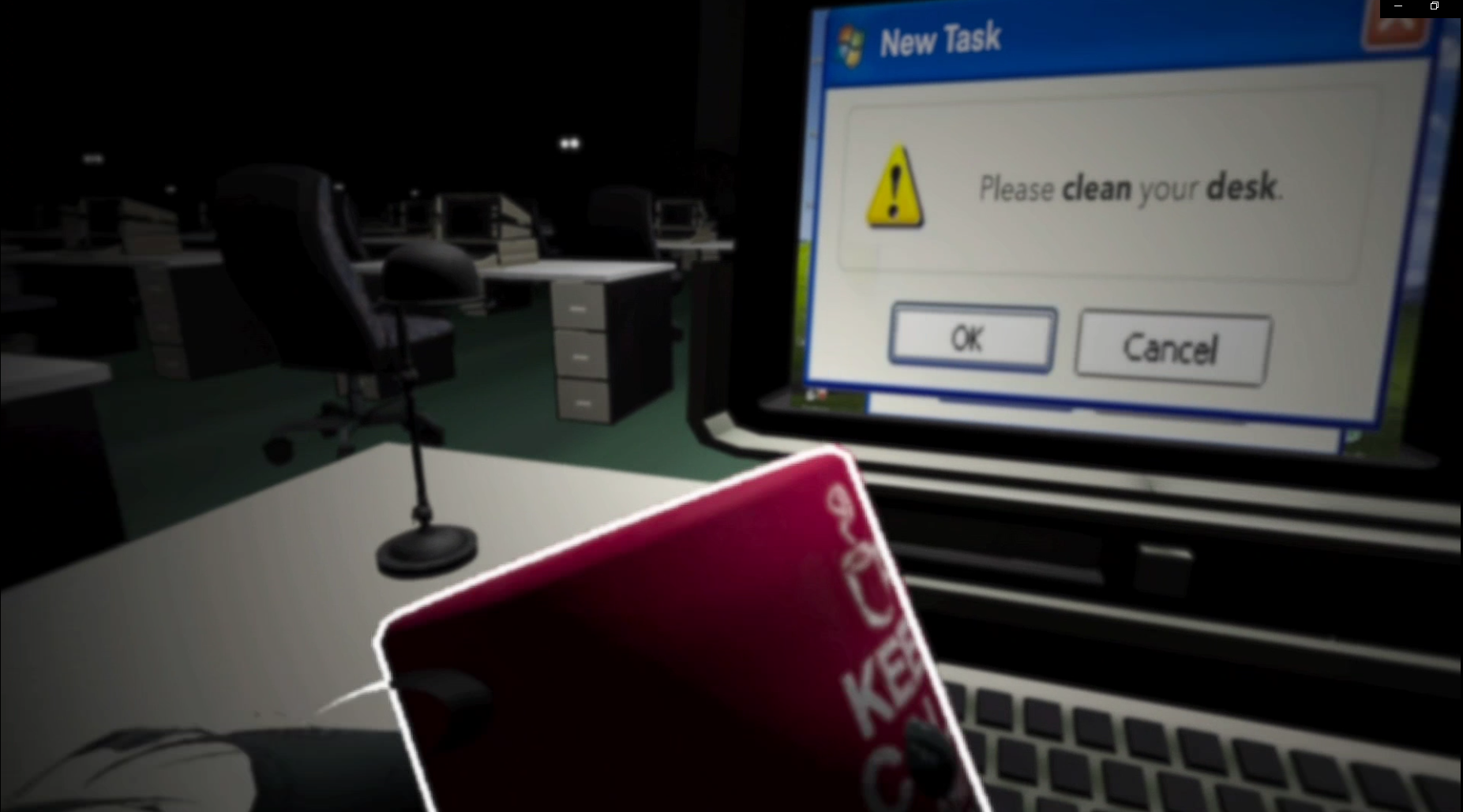 The gameplay in Workhorse is linear and narrative-driven. The player spawns at their desk in an office. Tasks are assigned by the boss via the computer.